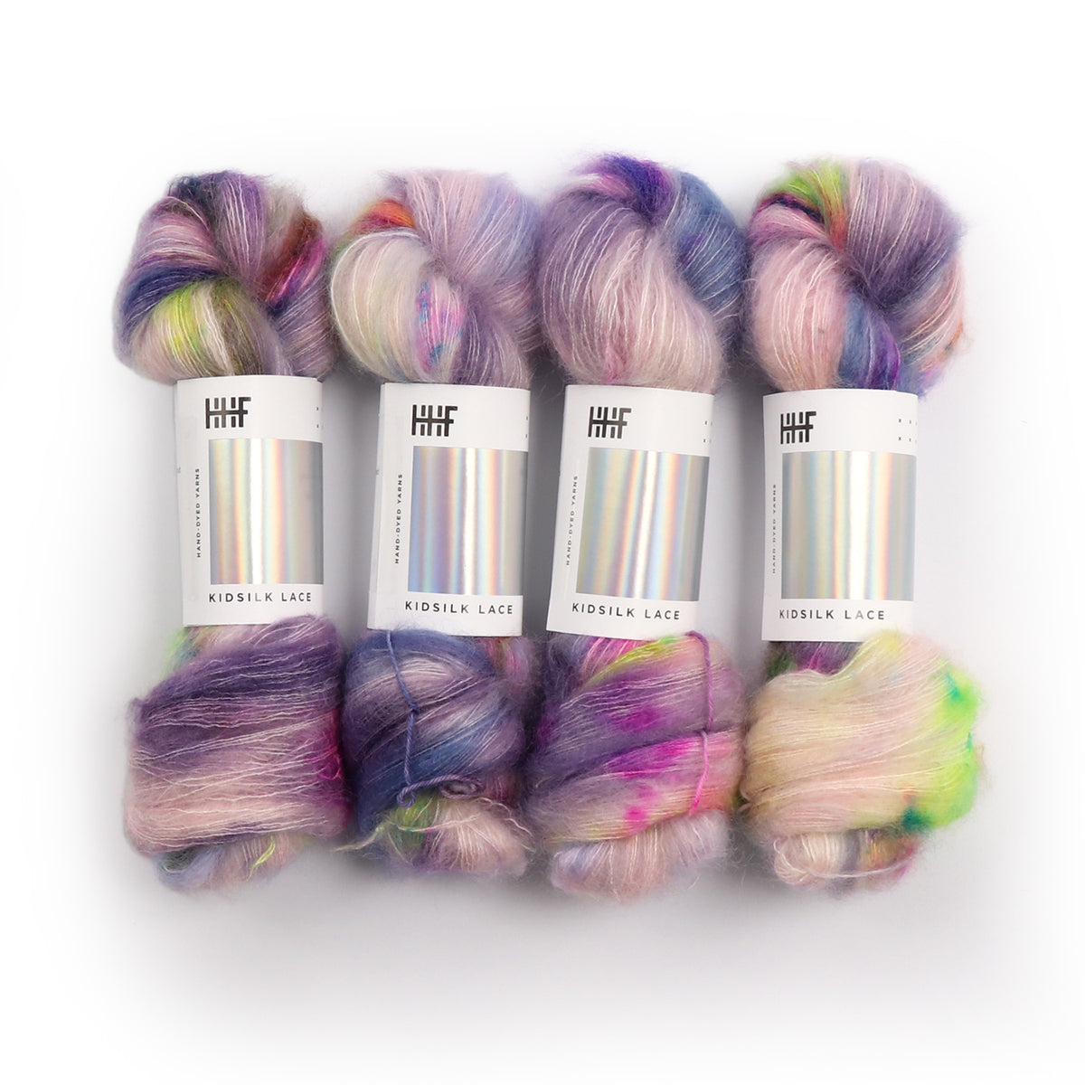 50g hand dyed lace weight yarn, Blend of soft kid mohair and silk. Approx. 420m per 50g. Glowing pure silk core wrapped in soft fuzzy mohair halo, the ultimate lace yarn.