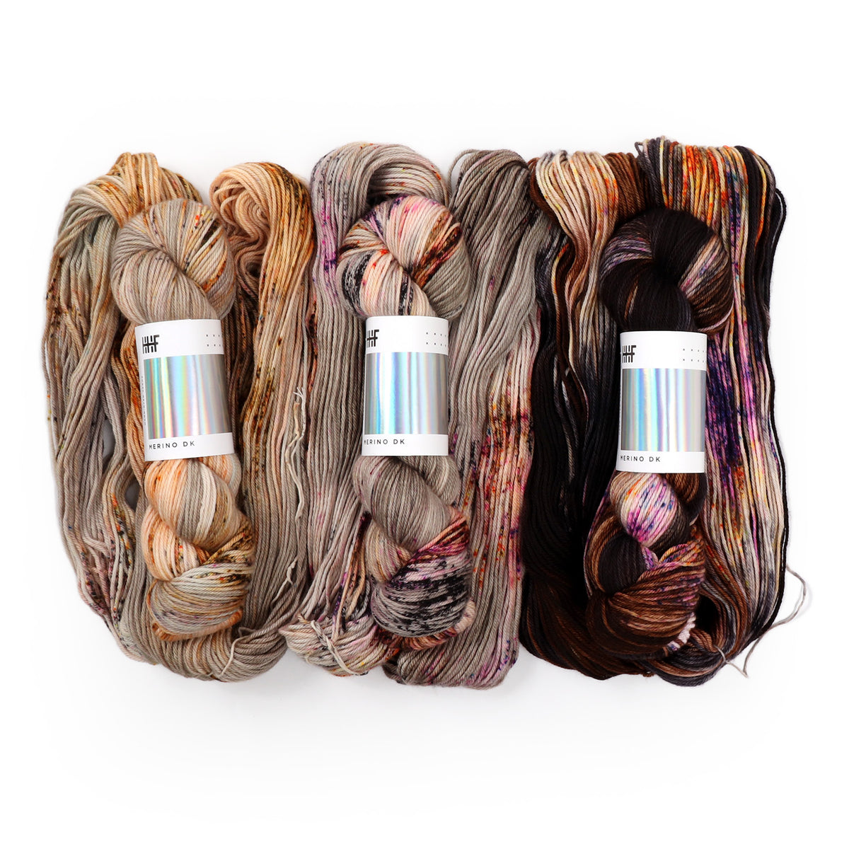Each set consists of 3x 100g hand dyed yarn. Our Merino DK base is a 100% Merino, DK weight yarn,