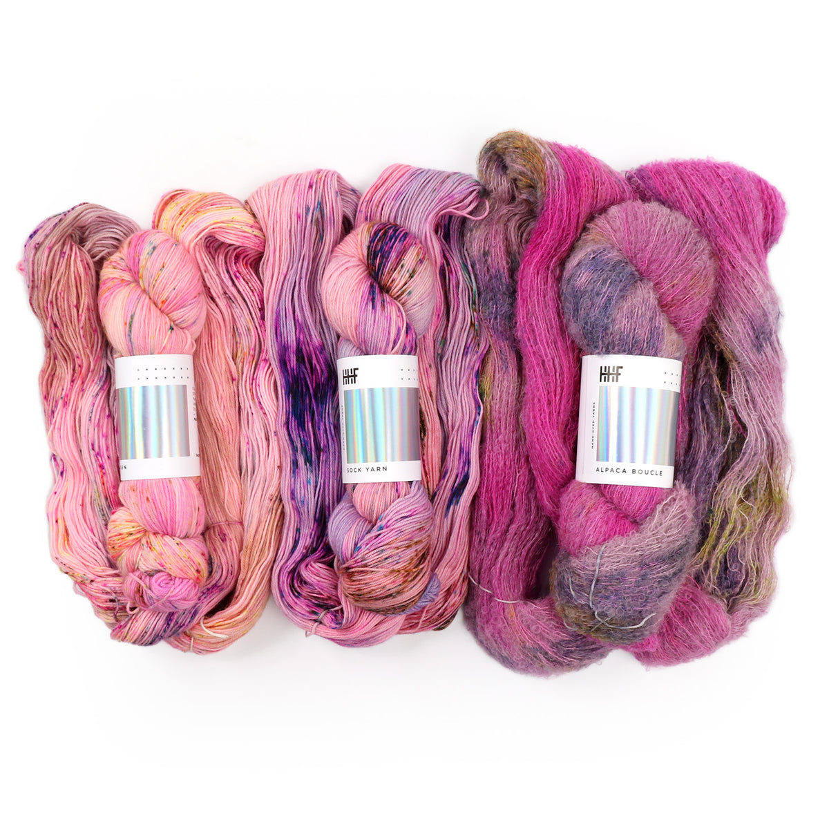 At Hedgehog Fibres we encourage our dyers to be creative and not just follow recipes. Potluck™ skeins are one of a kind skeins created by our artisan dyers under the watchful eye of Beata, who trains all our dyers and oversees all colourway creations.Each set consists of 2x 100g Sock yarn in two Potluck colourways and 1x Alpaca Boucle also in Potluck colourway